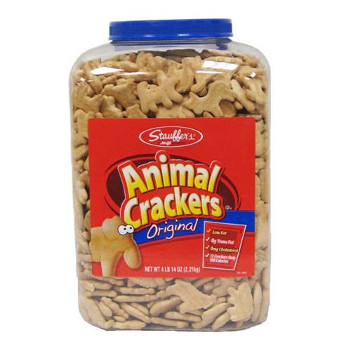 ?Low Fat Stauffer's Original Animal Crackers are a great snack for adults and children with 0 grams trans fat and 0 mg cholesterol. Thirteen crackers are only 100 calories. ?Over 1,200 crackers These are authentic style animal crackers, not cookies. Animal Crackers do not contain the high level of sugar as animal cookies do.